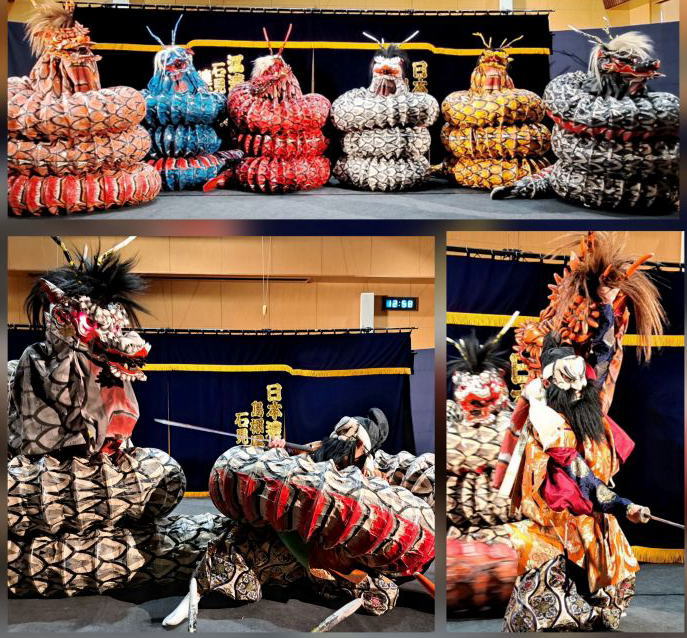 | 三宮神社での演目は天岩戸と大蛇。 日本神話でも有名な“(ヤマタノオロチ)退治”を題材にした「大蛇」。 17メートル近くの大蛇がスサノオを相手に火花を散らしながら暴れるシーンは迫力満点です! |
