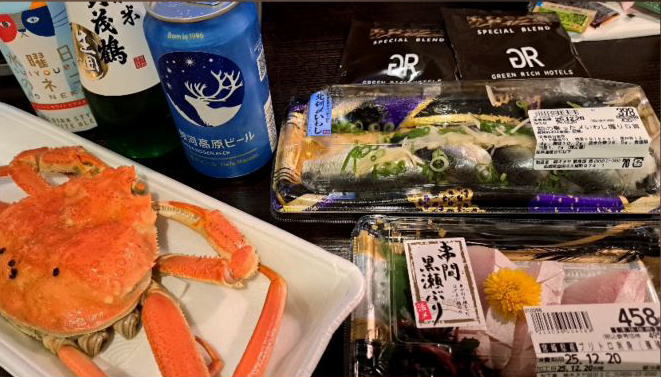 | 城崎温泉のス−パ−でビジホ飲み用にご馳走を買って、豊岡に向かいました。 | ||