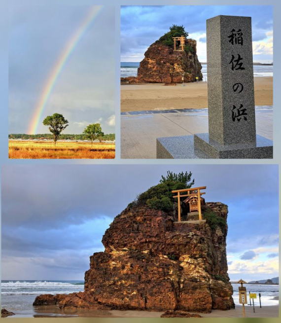 | 小雨が降ったり止んだりの天気で、バスからは虹がくっきり見えて幸先のいい朝です。 大社前を通り過ぎ、稲佐の浜でバスを下車。ここで砂をもらっていきます。 砂をすくう時は波が引く時ではなくて、波が押し寄せてくる間合いがいいみたい。 |