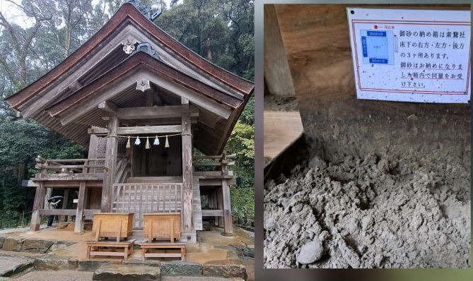 | 御祭神は素戔嗚尊で、天照大御神の弟神で、大国主大神の親神でもあられます。 お社の軒下には砂箱があり、ここに稲佐の浜で頂いたお砂を奉納して、代わりに置いてあるお砂を いただきます。この砂を持ち帰り、土地に埋めると素鵞社のパワ−で守られ、お守りにするのもいいようです。 |