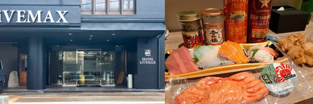 | 夜9時半過ぎにホテルに戻ってきました。今宵は海の幸満載のつまみにビ−ルと日本酒で独り宴会♪ | ||