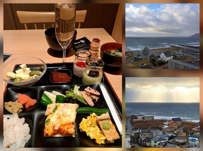 | 朝も絶景露天風呂で癒されて、朝食会場へ〜♪ 朝はスパークリングワインが飲み放題♪。チ−ズやピクルスがワインにぴったり。 いくらてんこ盛りで贅沢な海鮮丼も仕上がりました。さすがは函館です。幸せ〜(^。^)y-.。o○ |