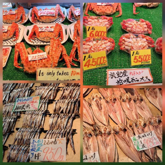 | 釧路駅では1時間ほどあったので和商市場に行ってみました。 正真正銘のししゃもは釧路産、漁期は1ヶ月と短いそうです。 |