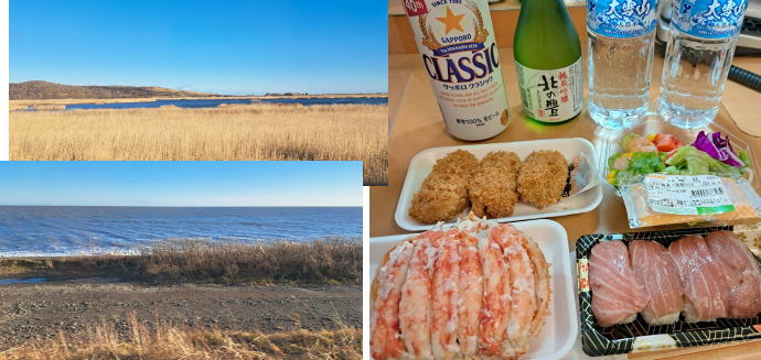 | 厚岸から釧路までは快速列車。釧路駅からは帯広〜札幌までは特急列車が走っています。 太平洋を眺めながら、帯広に到着。 ホテルの前にはセイコ−マ−ト♪ 今宵はビジホ飲み(^。^)y-.。o○ 釧路で買った海の幸とセコマのサラダとクラシック。 |