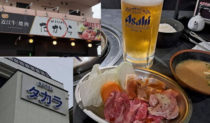 | 南座を出たのは午後6時40分頃でした。京阪〜JRで京都駅に戻り、ここから滋賀県の野洲駅に向かいました。 京都、大阪、奈良のBHは軒並み高い。乗り放題パスがあるんだから、少し離れた格安の宿を探したら野洲でした。 ここは焼肉店も併設しているから、とっても格安で近江牛まで食べられました。 |
