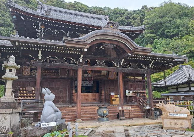 | 三室戸寺の本堂前に石で造られた大きな牛の像が狛犬のように鎮座しています。 宝勝牛と名付けられ大きく開いた口中には石の玉があり、これを撫でると勝運がつくようです。 狛牛と対面して兎が安置されています。狛犬ならぬ狛兎です。 兎の抱いた球の中にある、卵が立てば昇運がつくといわれています。 |