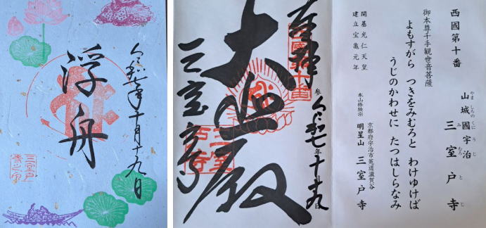 | 源氏物語の中でも光源氏亡き後の「宇治十帖」が好きで、その中の浮舟の場面に感銘を 受けていたので、西国十番の御朱印と共に、浮舟のご朱印もいただきました。 |