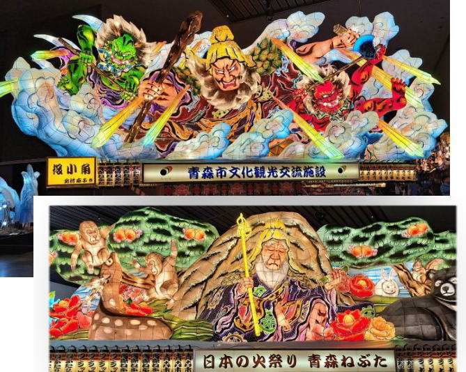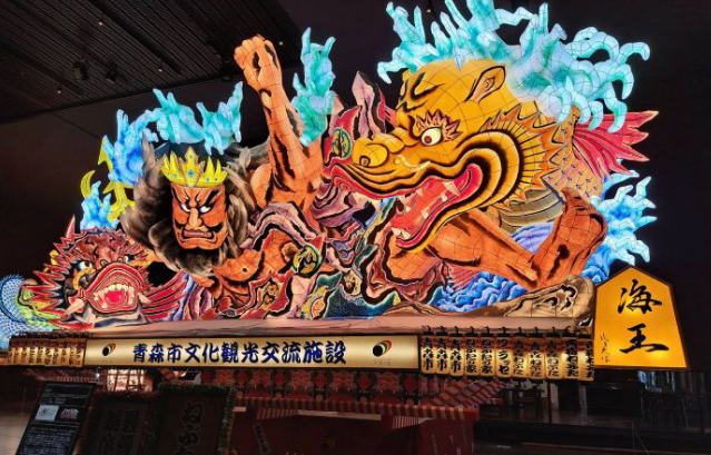 | 新青森からひと駅で青森駅に着きました。まずは駅前のワラッセに入りましょう。 今年の青森ねぶた祭りは8月4日に見物しましたが、今年入賞の大型ねぶたが4台展示されています。 ねぶた大賞の「海王」は、今年が青森港、開港400年の節目なので、海の守護神ポセイドンをねぶたで表現したのだそう。 |