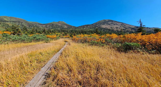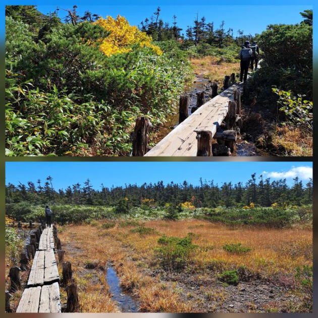 | 見晴らしのいい木道歩き、空も青くて清々しい。草紅葉も始まっています。 | ||