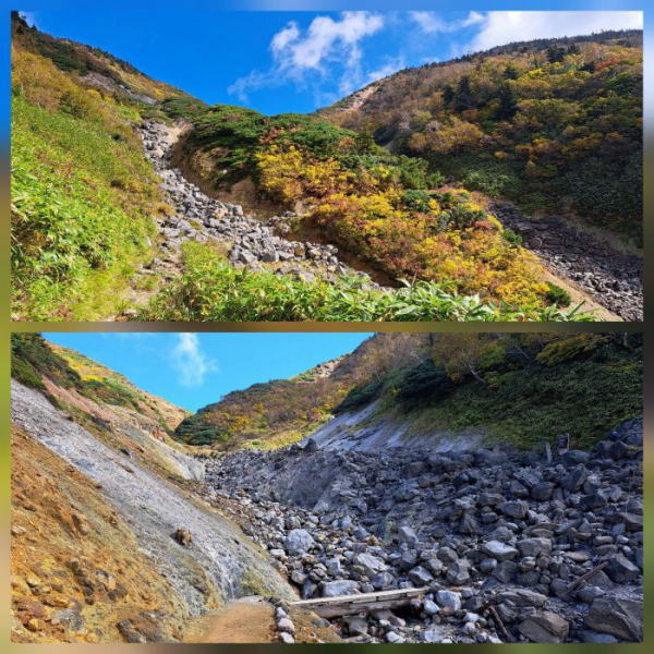 | 酸ケ湯温泉から右回りに大岳へ周遊しています。 このガレ場を登っていくと、一旦開けた場所に出て、木道がありました。 |