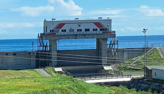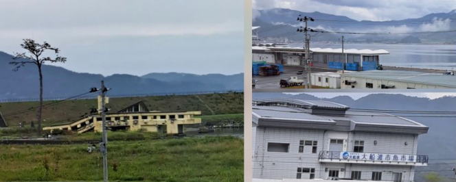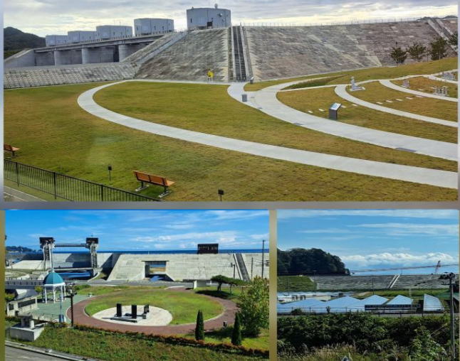 | 復興の様子、今の三陸海岸の景色を静かに眺めることができました。 水門の上に三陸鉄道の車両のデザインに似た建物が・・・。 いったい何だ??? |