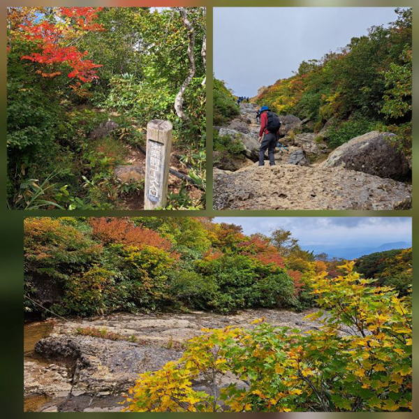 | おときゅう4日目、盛岡から新幹線に乗ってくりこま高原駅へ。 紅葉シーズンの週末はシャトルバスが出るのでそれに乗りました。(予約制片道2000円) バスは8台〜ほど出たのかな?路線バスの車両だったので、全員座れる人数は26名ほど、 ゆったりと1時間15分後にいわかがみ平に到着。行きは登りは沢沿いを歩く、東栗駒山コース |