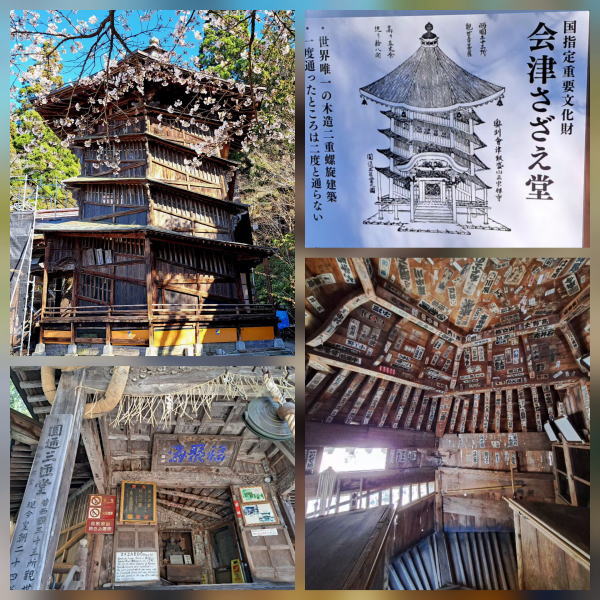 | その前に・・・飯盛山には会津さざえ堂もあります。入ってみましょう。 会津さざえ堂は(円通三匝堂)1796年に建立された、六角三層のお堂で、 西国三十三観音像が安置されていたようです。 2重螺旋のスロープに沿って参拝者はすれ違う事なく三十三観音参りができました。 |