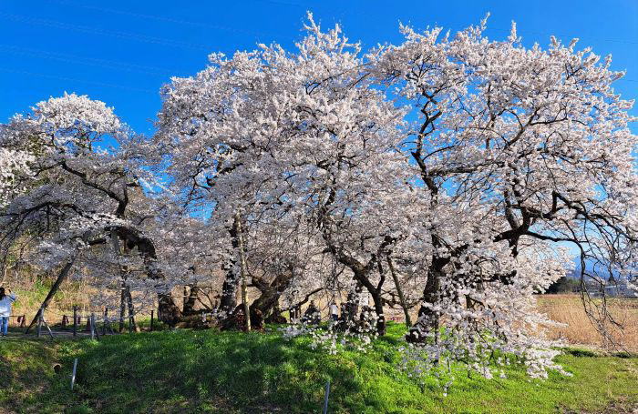 | 石部桜は「大河ドラマ『八重の桜』のオープニングにも出てきた桜です。 田んぼにの中にありました。10本の幹からな り、枝張は最も広いところで約20mもあり、 のびのびと枝を広げるその雄大な姿に魅了されます。 |