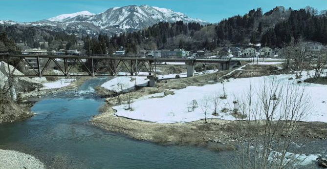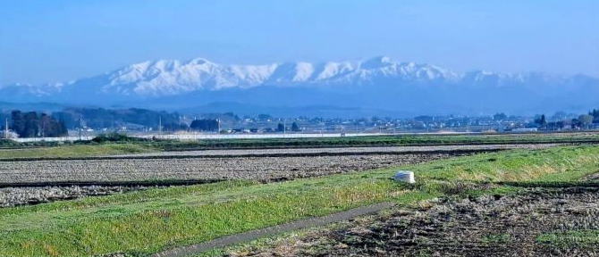 | 残雪が多くなり、福島県から新潟の魚沼市に入ってきました。 守門岳方面かな?、上越の山々が見えてきました。 |