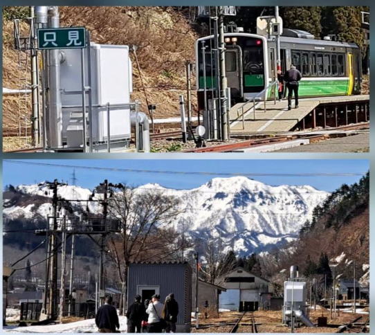 | 只見駅で25分ぐらいの待ち合わせがあり、みなさんホームに出たり、売店を見たり…。 進行方向には八海山、越後駒ケ岳などの越後三山が見えてます。 |