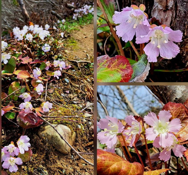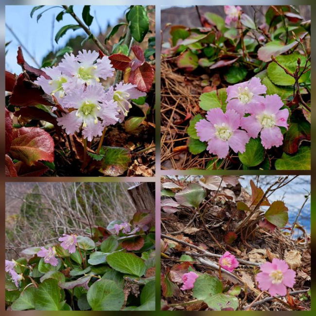 | 階段状の登山道になると、イワウチワ 道の両側にイワウチワ |