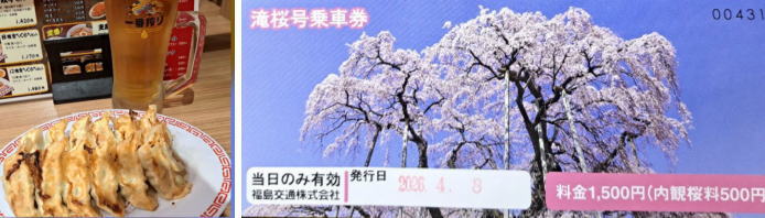 | 4月7日、17:30 健太餃子(宇都宮) 4月8日、 郡山〜三春 8:30発 滝桜号 | ||